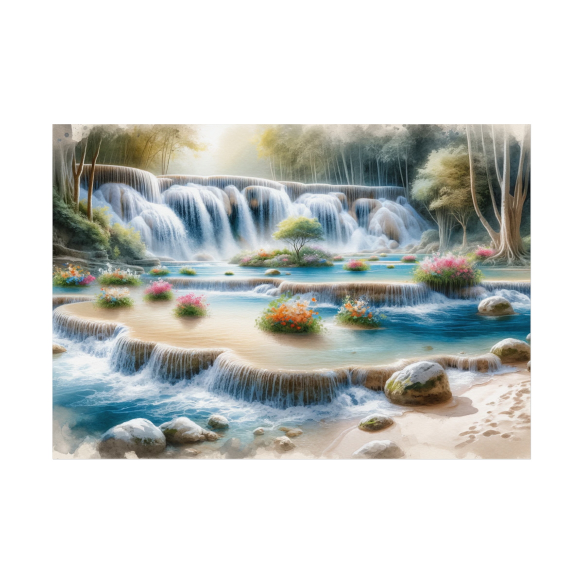 Watercolor-Style Painting of Waterfall Poster